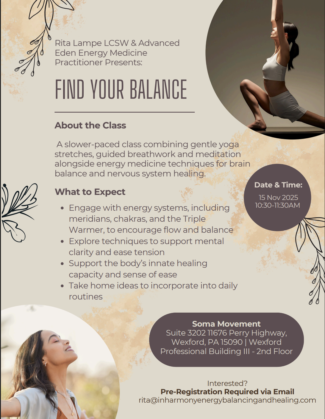 Rita Lampe LCSW & Advanced Eden Energy Medicine Practitioner Presents: Find your balance. A slower-paced class combining gentle yoga stretches, guided breathwork and meditation alongside energy medicine techniques for brain balance and nervous system healing. Register for this class through Rita Lampe. rita@inharmonyenergybalancingandhealing.com
